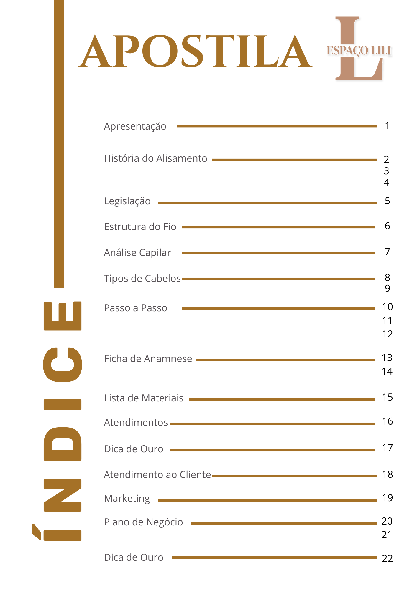 A apostila de Alisamento Capilar é um guia completo e essencial para qualquer profissional que deseja se especializar na técnica de alisamento capilar. A apostila explora a fundo a estrutura do fio de cabelo e a análise capilar, abordando os diferentes tipos de cabelos e oferecendo um passo a passo detalhado do procedimento. Inclui uma ficha de anamnese e um modelo de ficha para facilitar o atendimento personalizado aos clientes.